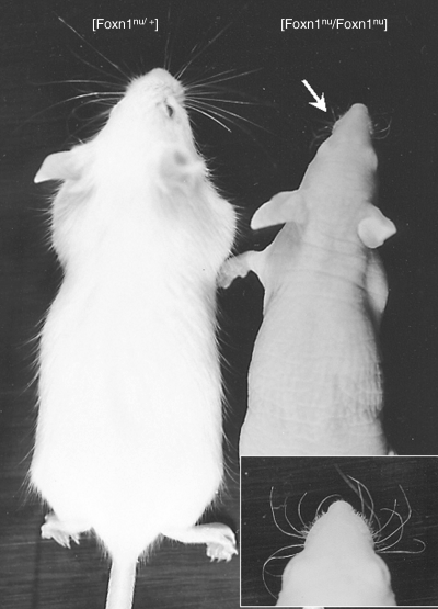 图2. nu/nu小鼠(右)与正常毛发的杂合(nu/+)同窝小鼠(左)[1]。