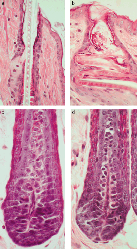 图1. 背部皮肤组织学。a. 野生型(+/+)正常发育的毛杆;b. 裸鼠(nu/nu)毛杆扭曲盘绕在膨胀的毛囊漏斗内;c. 野生型(+/+)毛囊;d. 裸鼠毛囊与野生型(+/+)相比,没有明显区别[1]。